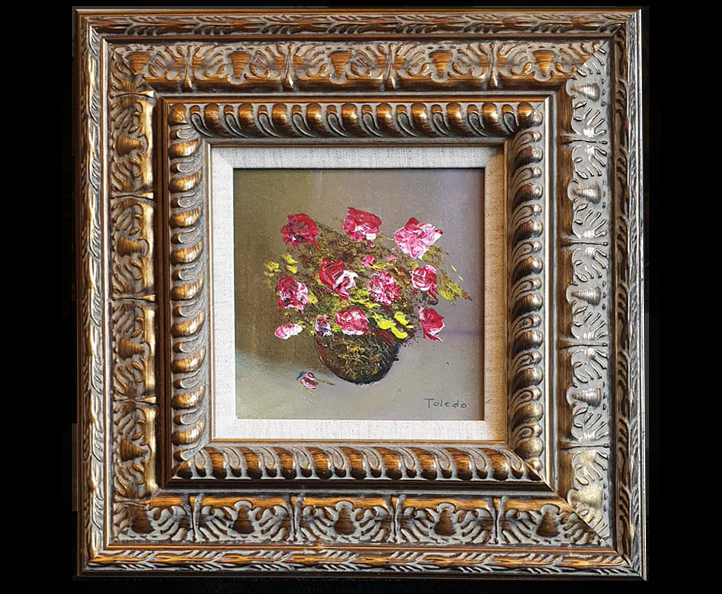 ornate gold handfinished frame with a white bevel slip frame gave this little bouquet all the feel of an old masterpiece