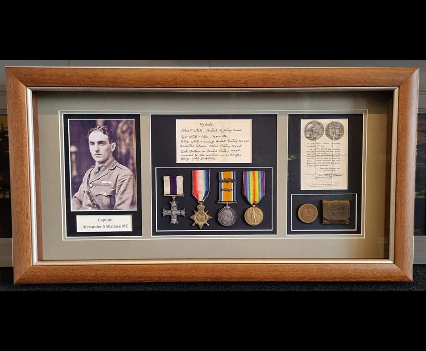deep rebate wood tone frame with champage slip frame, complimenting double mounts with multiple apertures to accomodate the various sized items. This one had a medium recess slip so the items were set back from the artglass.