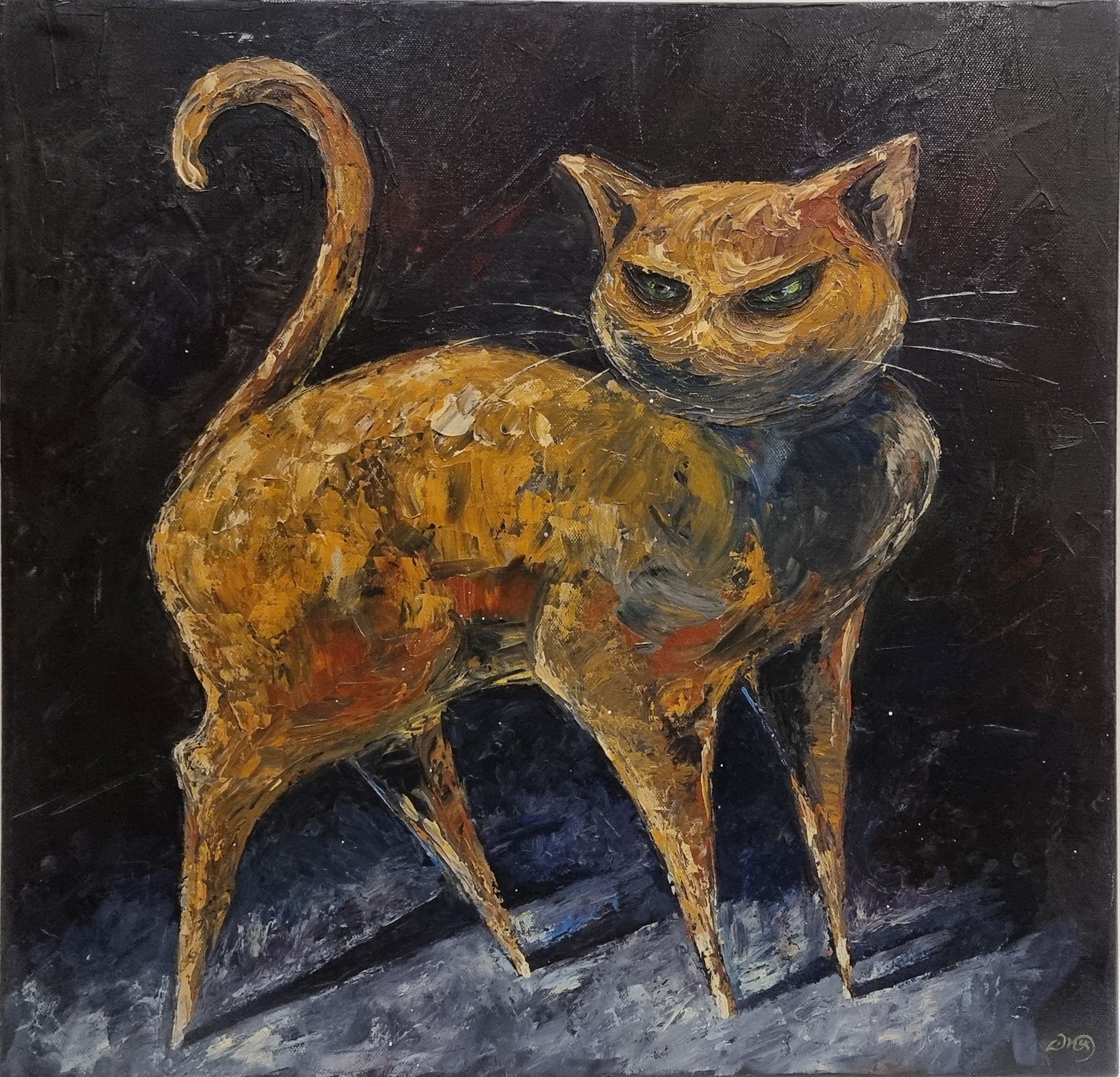 A stylised depiction of ginger tom cat, this piece is box stretched with the dark coloured paint covering the sides.