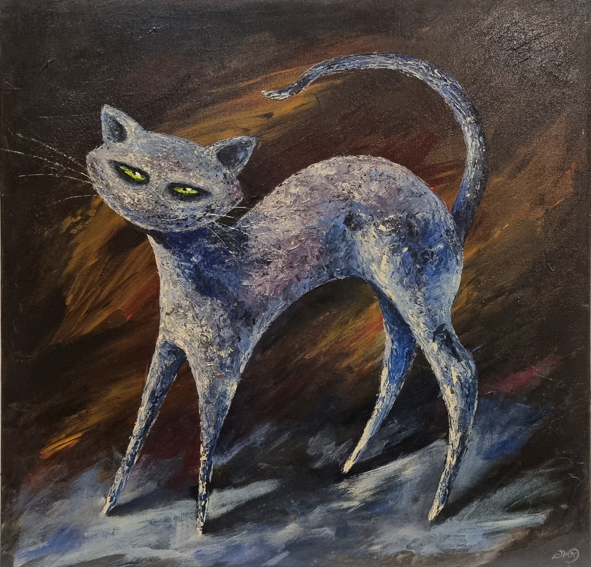 A stylised depiction of blue grey cat, this piece is box stretched with the dark coloured paint covering the sides.