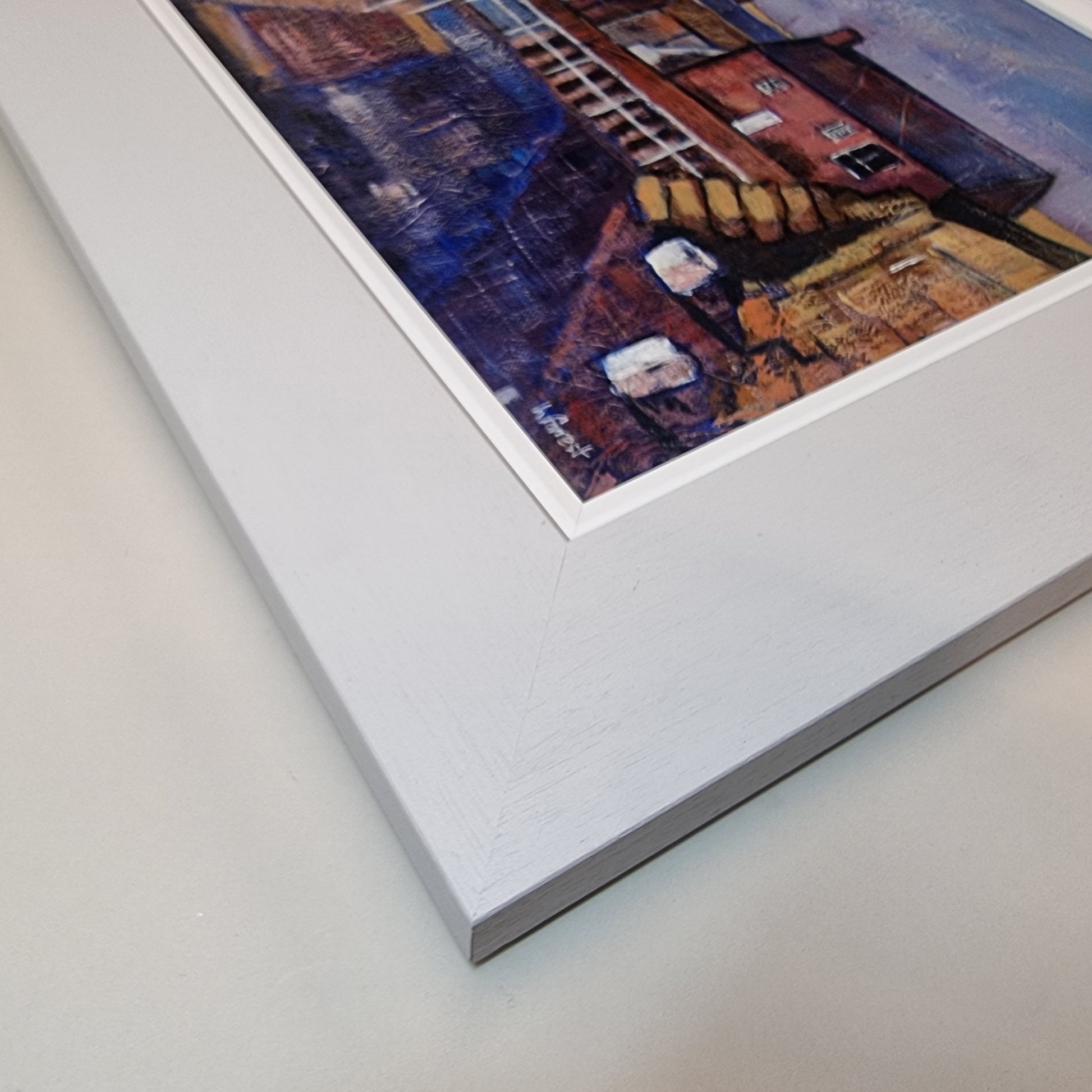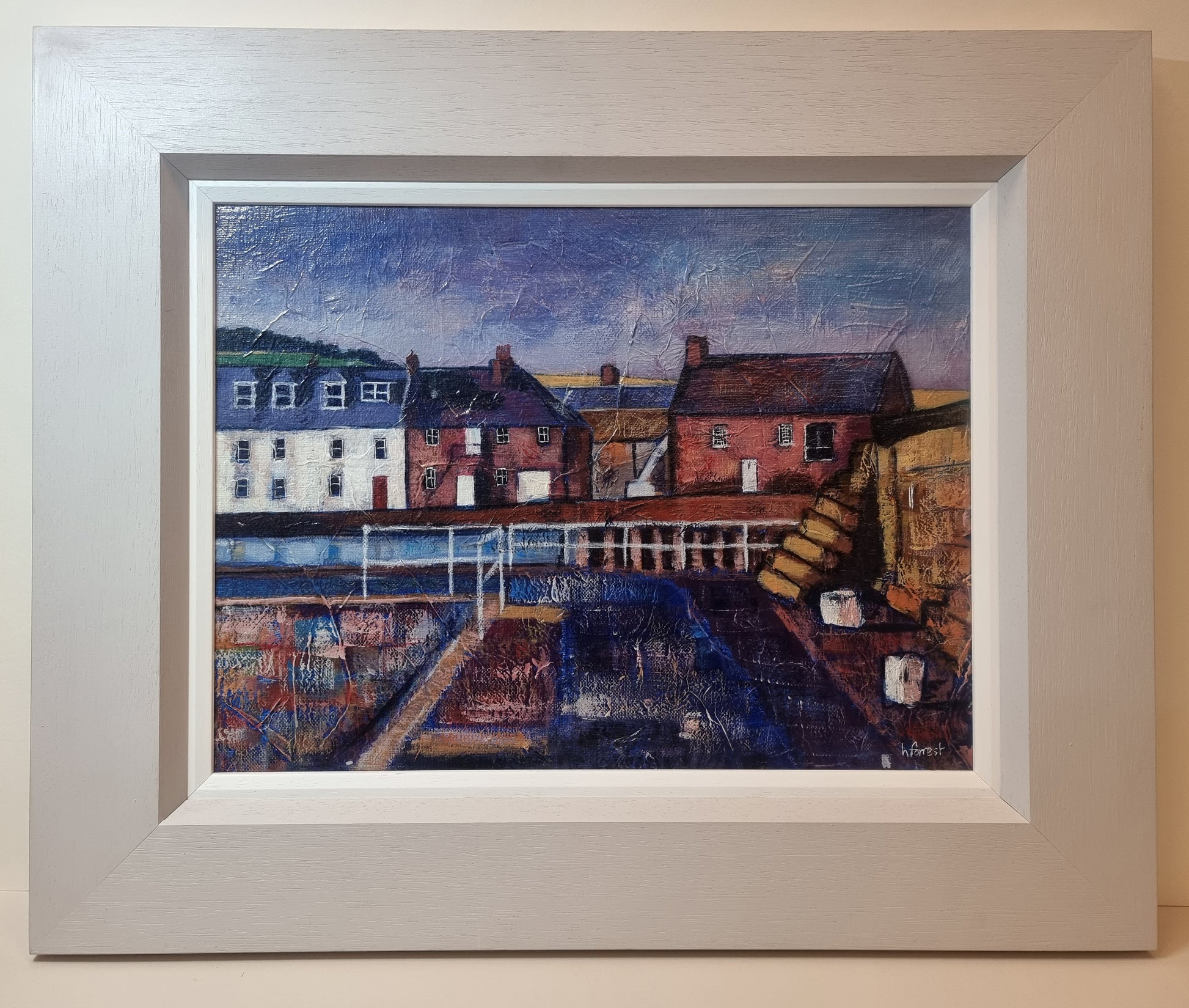 Stylised landscape painting of the tollbooth in Stonehaven harbour.